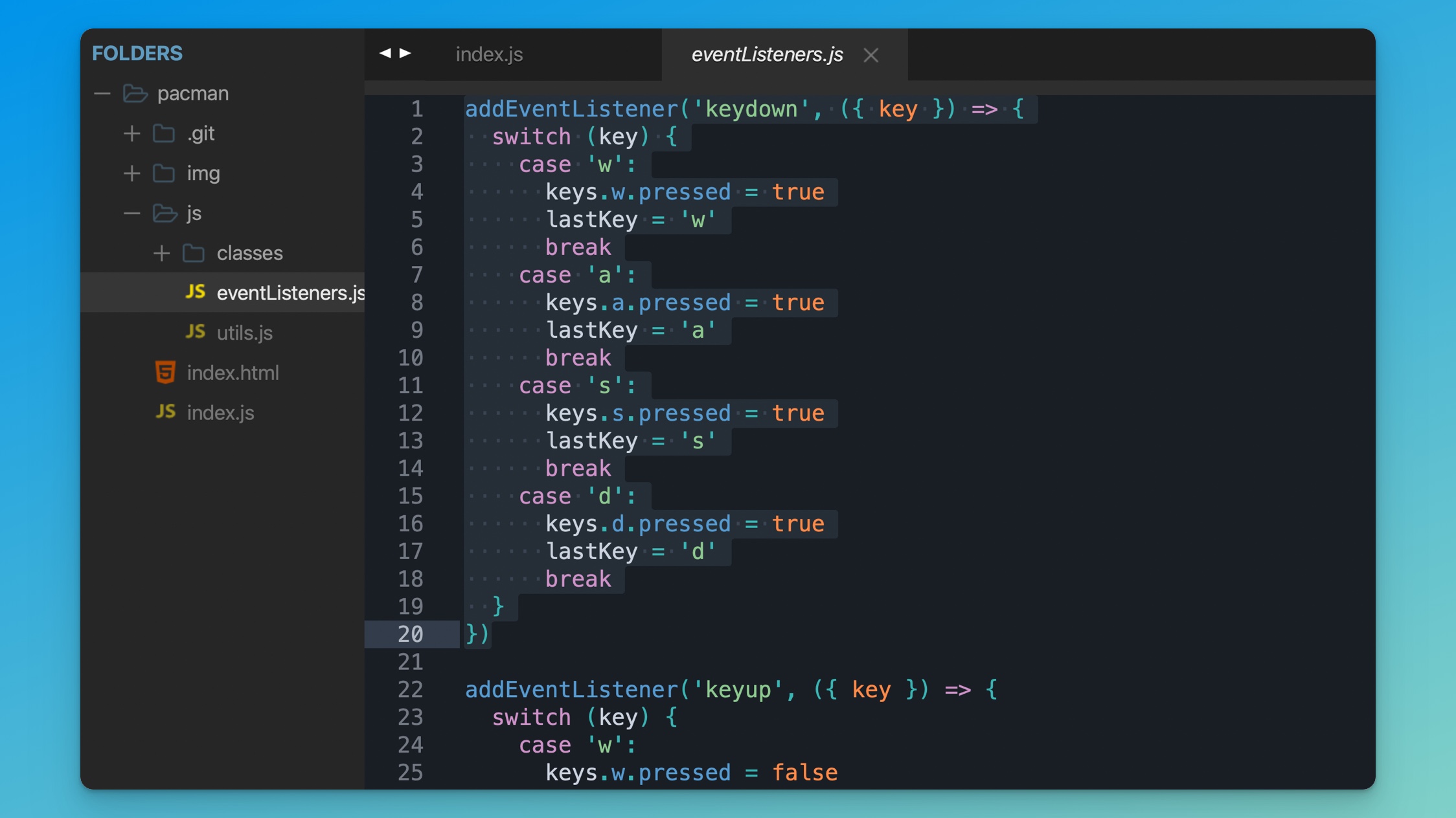 In the end, we may have written more code, but it is much more understandable and organized since we can easily locate everything related to moving our player up, compared to having to use some brain power to find it prior.